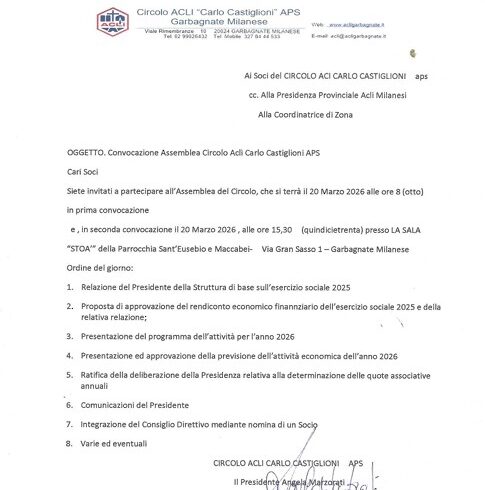 Si invitano i soci a partecipare all’Assemblea Ordinaria che si terrà in seconda convocazione venerdì 20 marzo 2026 alle ore 15.30 presso la sala STOA’ Parrocchia S. Eusebio e Maccabei via Gran Sasso 1 Garbagnate Milanese.