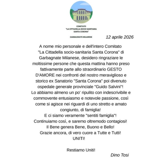 Pubblichiamo il ringraziamento del Presidente del comitato LA CITTADELLA SOCIO-SANITARIA SANTA CORONA